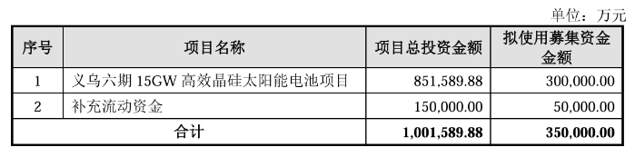 公告显示,本次募集资金中,30亿元用于义乌六期15GW高效晶硅太阳能电池项目,5亿元用于补充流动资金。