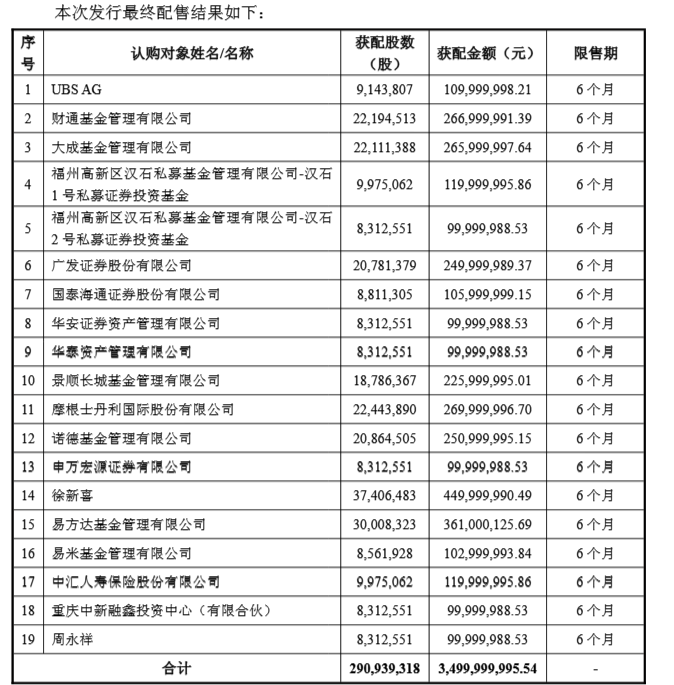 具体来看,姓名为“徐进喜”的认购对象获配金额最多,达4.50亿元;易方达基金获配金额位居第二,为3.61亿元;摩根士丹利国际获配2.70亿元。