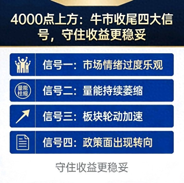 A股站稳4000点后,市场波动明显加大,很多投资者都在担心行情走到阶段性高点,不知道该怎么守住已经赚到的收益。判断牛市是否接近尾声,不用靠猜测,也不用听小道消息,只要盯紧四个真实可感知的信号,就能清晰把握市场节奏,在高位行情里稳扎稳打,不盲目追高也不轻易踏空,把利润稳稳拿在手里。