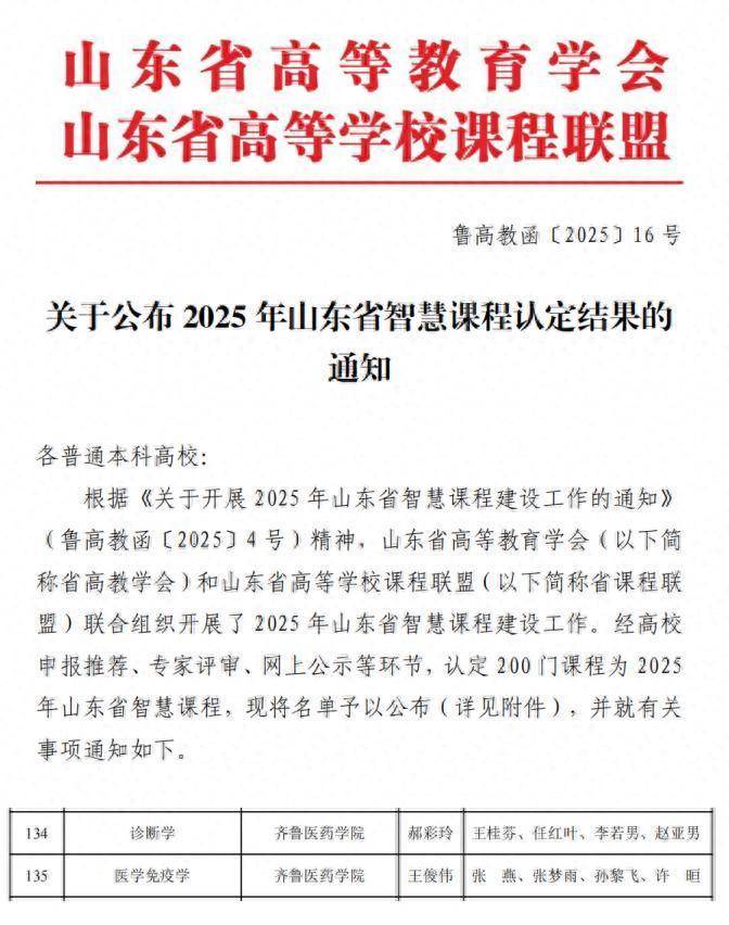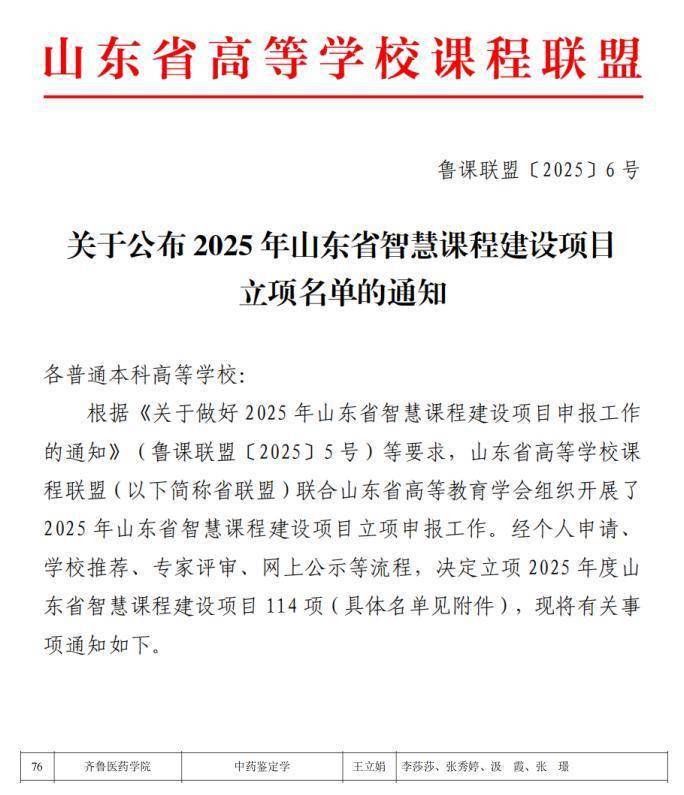 近日,山东省高等教育学会、山东省高等学校课程联盟公示了2025年山东省智慧课程认定结果和智慧课程建设项目立项名单,齐鲁医药学院2门课程认定为山东省智慧课程股门在线,1门课程获批山东省智慧课程建设项目立项。